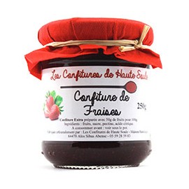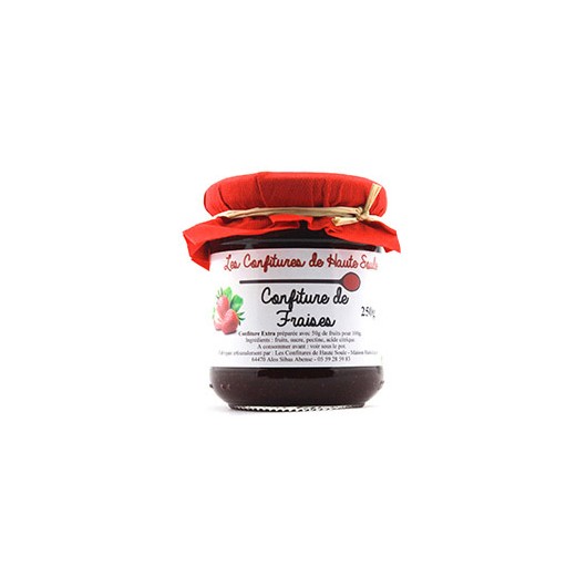Confiture de fraise artisanale du Pays-Basque cuite au chaudron en cuivre, à l'ancienne, préparée avec 50 gr. de fruits pour 100 gr.